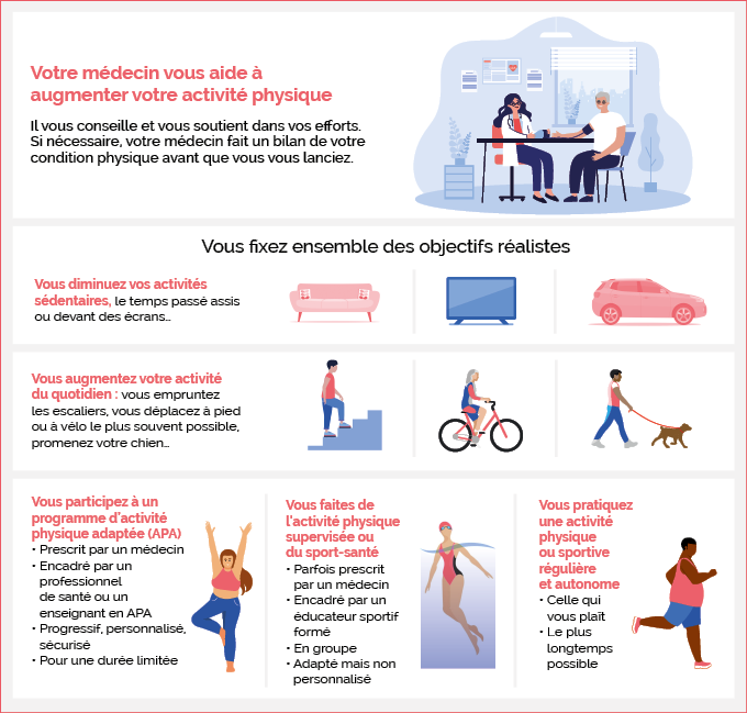 Voici des conseils généraux pour vous aider à augmenter votre activité physique et à trouver les bons soutiens. Si vous êtes atteint d’une maladie chronique, ou dans certaines situations comme la grossesse ou l’avancée en âge, une fiche conseils spécifique complétera ces informations (voir liste ci-dessous).