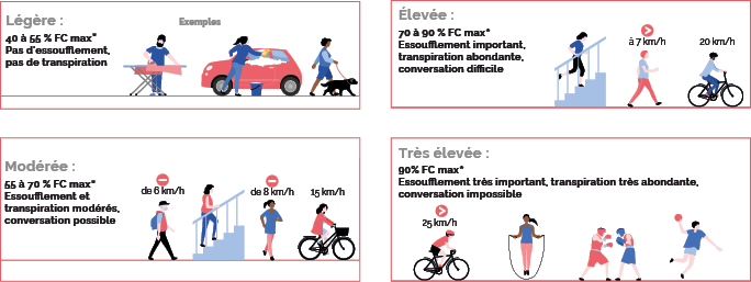 On distingue différents degrés d’intensité de l’activité physique selon la fréquence cardiaque (FC) qu’elle provoque.