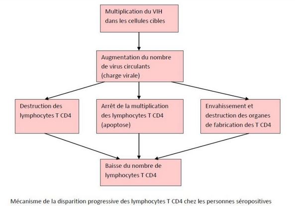 Plus la quantité de virus est importante, plus le nombre des lymphocytes T CD4 diminue par la conjonction de trois processus