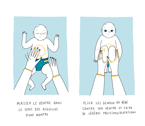 - Aidez-le en lui faisant faire une petite gymnastique des jambes (vous remontez ses jambes puis les dépliez doucement à la manière d’une grenouille). Cela peut l’aider et le soulager.