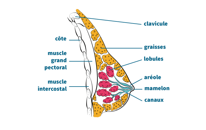 Les seins féminins se composent de plusieurs éléments distincts. Au centre se trouve le mamelon, une partie externe située à l'extrémité antérieure du sein. À partir du mamelon, s'étendent divers canaux galactophores qui conduisent aux lobules, des glandes internes responsables de la production de lait après l'accouchement. Ensemble, ces éléments forment la glande mammaire, positionnée sur la partie avant du sein.